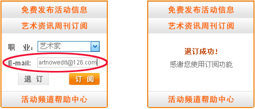 A、进入“活动频道”首页,点击“活动分类”右侧“艺术资讯周刊订阅”,出现下拉界面