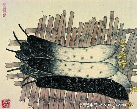 四 中国文人水墨传统,得益于书法的早熟,同时也为中国水墨建立了一个经久不息的游戏规则,即在法度与自由之间建立了一个永远可以玩下去的规则。如同“人”字,一撇一捺,几千年如是,但我写的“人”字和你写的“人”字,在撇捺的间架结构上,在用笔的力道和气质上千差万别。你如果能通过一撇一捺,把你的情感、你的修养、你的学识、你的才气、你对时代的理解表达出来,并获得这个时代相当多数人的共享,你的作品就是好作品。同理,传统文人画中的山水,梅、兰、竹、菊,相当于字形,也是不变的,艺术的变化,靠的是不同人的“性灵”因素,所以历代文人才强调“功夫在诗外”。文人画这种语言模式被悬置的现象,与西方强调语言模式不断革新完全不同。 尽管如此,在文人画的系统里,我们依然可以断断续续看到偶以瓜果菜蔬题材入画的现象,且多偏重“生活情趣”的捕捉。直到齐白石的作品,才有意识地发展了这条“生活情趣”的线索,画中题材也丰富多样起来。齐白石出身于农家,亦无功名,所以能以自然质朴的趣味,把常见的菜蔬、瓜果,农家常见草虫入画,创造出一种清新的自然气息。这是我想从新题材挖掘的角度推荐老圃加入这个展览的原因。