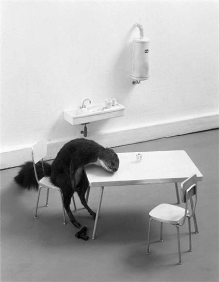 毛里乔奥·卡特兰,《BIDIBIDOBIDIBOO》,松鼠标本、陶瓷、胶木板、树木、油漆、钢铁(Maurizio Cattelan, BIDIBIDOBIDIBOO, 1996)伦敦 Laure Genillard 画廊|图片提供