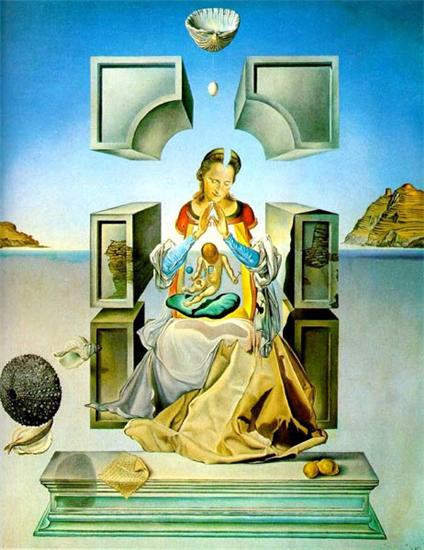 达利所创作的《利加特港的圣母》有两幅,两幅在画面结构形式上基本相同。画面背景是利加特港,前景是祭坛上的圣母和圣婴,圣母温柔神圣,双臂抬起,成金字塔型,指间相对,手掌也成金字塔型,罩住下面的圣婴。她的胸腔是空的,不过有建筑的空间和厚度。圣婴在她的胸中腾起埋着头,双手向身体两侧张开,手和头也形成神秘的金字塔型,心是空的,他的头位于海天交接之处,也正是圣母的心的位置。他的两手一只托起一个球体(原子核),另一只手拿着一个十字架,双腿向一侧摆开,影子投射在下面的坐垫上,垫子又投影在圣母的裙子上。圣母坐在圣坛上,下方的基座上放有一张圣经,另一边放两个球。但所有一切都是悬浮的,圣母和圣坛的后壁都悬浮于空中,圣坛的后壁不仅悬浮而且中间断为两半,上下短为三截,第一截的断口和中间的断口组成一个虚空的十字架,交汇于圣母的头部。值得一提的是十字架的顶部有一个象盆子一样的大贝壳,下悬一金蛋,而下面圣母的头顶向蛋壳一样破开。而画面所有的一切虽似幻非真,却严格地遵守透视原理,灭点在圣母的头部。背景分成两部分,上部分是湛蓝的天空颜色上深下浅,下部分占2/1强的是茫茫利加特港的海滩,上有几个不知名的海洋贝类动物,中间海天交接处两边是山,海天远处透出金色的光,象是神性的光辉,也仿佛这光是从圣母的胸中透出。