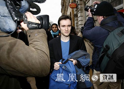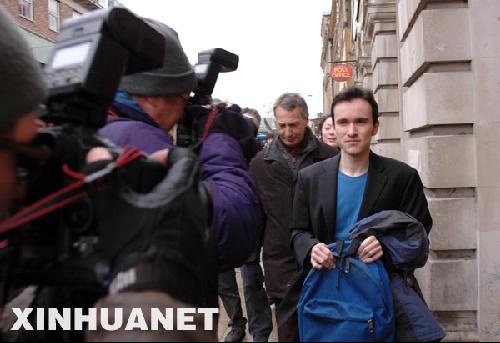2月10日,干扰温家宝总理演讲的德国籍学生扬克(右一)离开英国剑桥地方法院。新华社记者马桂花摄