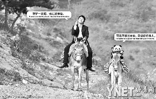 本报讯 国际戒烟日到来之际,艺术家赵半狄的熊猫戒烟公益广告在长城揭幕,同时也是这幅戒烟公益广告在中国各地发布的首发仪式。广告画面中,夕阳下的田园小路上,男人和国宝熊猫各自骑着小毛驴悠闲而来,抽着烟的赵半狄神色得意:“骑驴一支烟,赛过活神仙”,国宝熊猫款款地说:“可我不想当神仙,只想好好做人”。