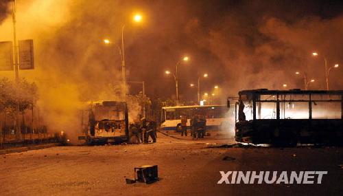 7月6日凌晨,在乌鲁木齐市大湾南路的跑马场地段,多辆公交车被烧毁,消防官兵赶到现场救援。新华社记者沈桥摄