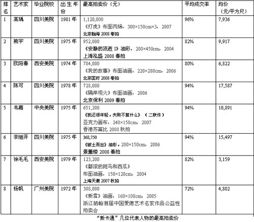 此外,数据显示在2008年秋拍中,各新卡通艺术家的成交率和拍卖指数均有不同幅度的下滑,并在2009年逐步回温,表明全球金融海啸对这一板块还是产生的一些负面影响,但并未真正削弱新卡通绘画的市场竞争力。例如,陈可的布面油画《隔岸观火》在5月29日的北京保利2009春拍中拍出72.8万元的高价,显示市场对于这一板块的态度依然信心十足。但在另一方面,经济危机直接引发了年轻新卡通艺术家的生存问题。许多画廊和美术馆因为资金短缺不得不减少展览预算,使得刚刚走出校门的年轻艺术家工作量减少,甚至无法找到资金支持自己的创作,或者很难在充满诱惑的市场中坚持自己的艺术追求。随着新卡通绘画的高潮经渐渐回落,这个问题对于“80后”艺术家来说尤为严重。他们的艺术生涯差不多与中国当代艺术市场同步启动,“80后”、“青春”、“动漫”、“垮掉的一代”已经成为刻在这个群体之上的描述性定义甚至商业标签,一定程度上掩盖了群体中个体的独立性。而如何在商品经济时代中寻求个体生存、艺术创作独立性与市场评判的平衡成为这一代艺术家共同面临的问题。
