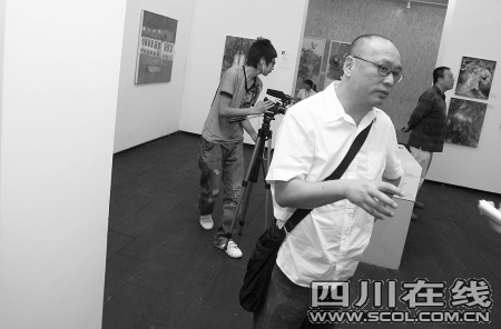 昨日下午1点半,离“蓝顶艺术群落作品展”正式开展还有1个半小时,记者在宋庄美术馆看到了不少提前抵达的观众。美术馆一楼3000多平方米的巨大展厅已被密密麻麻的成都艺术家作品占满,很多作品都是最近完成的,空气中还弥漫着淡淡的油彩香味。扑面而来的是当代艺术家周春芽高2米、宽2.5米的桃花系列之《花香袭人》,而在原作上面则是巨幅的《花香袭人》彩色喷绘,非常醒目,不少观众纷纷在画作前留影。