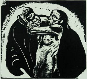 珂勒惠支作品《死神与女人》。“‘死’从她本身的阴影中出现,由背后来袭击她,将她缠住,反剪了:剩下弱小的孩子,无法叫回他自己慈爱的母亲。一转眼间,对面就是两界……”——鲁迅《凯绥·珂勒惠支版画选集·序目》