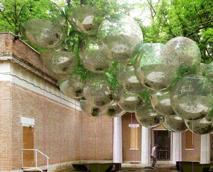 这一设计方案令该馆的庭院中充满巨大的聚酯气球,这些气球被系在地上,升起至不同高度,形成一个漂浮的顶棚,为聚在展览外的人们提供了荫蔽。设计师希望能够重现安迪·沃霍尔1966年用反光的聚酯气球做的展览“银云(Silver Clouds)”,将这一画廊展览扩展至都市规模。