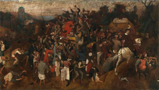 马德里报道——根据目前的历史书记载,16世纪尼德兰画家老勃鲁盖尔(Pieter Bruegel the Elder)名下一共有40幅作品。不过最近在西班牙有了一个惊人的发现,可能书本要重写了。马德里普拉多博物馆的研究者称,他们发现了一幅此前作者不详的作品其实是大师画的,这件描绘乡村风景的蛋彩布面油画幅面为5X9英尺(合1.5X2.7米),名叫《圣马丁日的酒》。