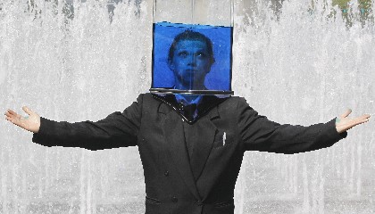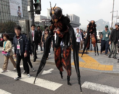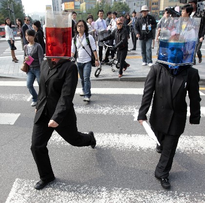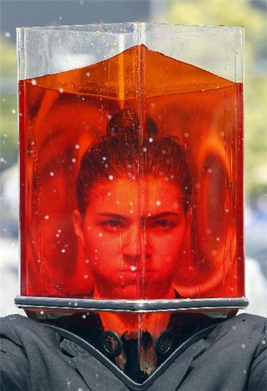 10月6日,在韩国首都首尔街头,表演者头戴内装彩色液体的透明头罩进行行为艺术展示,给观众带来了另类的街头视觉感受。作为“嗨,首尔”艺术节的一部分,这项行为艺术是由来自澳大利亚的街头表演团体创作表演的。