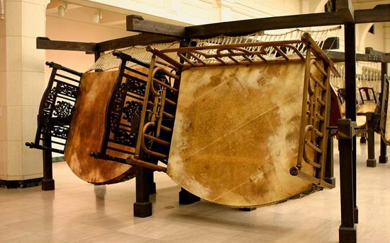 下面是大型装置作品《绝唱——舞身擂魂》(资料图)。1999年底,陈箴病痛趋烈,准备去印度和非洲寻找西医之外的治疗方法,由此想到创作“绝唱”。“绝唱”以10个床鼓和55只椅鼓组成,人手(人皮)击鼓时接触到鼓皮(牛皮),引喻为相互治疗,即当治愈了自身的同时也治愈了他者。陈箴这种禅机式的构思本想与好友谭盾共同完成,可惜生前未能实现。按照陈箴生前愿望,谭盾为“绝唱”特别谱写了一首曲子,并创作了“击鼓法”。中国舞蹈家黄豆豆和一名日本鼓手、一名美国鼓手一起在其间舞身擂魂。黄豆豆以前所未有的热情投入到这部作品的演出中,以至于在演到第十七八场时,将左脚跟腱外侧三分之一跳断了。“我们按照谭盾创作的‘击鼓法’进行表演,既扮演舞者也是音乐的演奏者。身为舞蹈演员,我在其间运用了身体的各个部位,每一个关节、肌肉都在演奏,尝试各种动作,可以说与陈箴进行了一次超越时空的精神对话。”