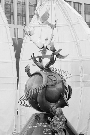 列侬的首任妻子辛西娅和儿子朱利安参加了18英尺的纪念雕塑“和平与和谐”的揭幕仪式