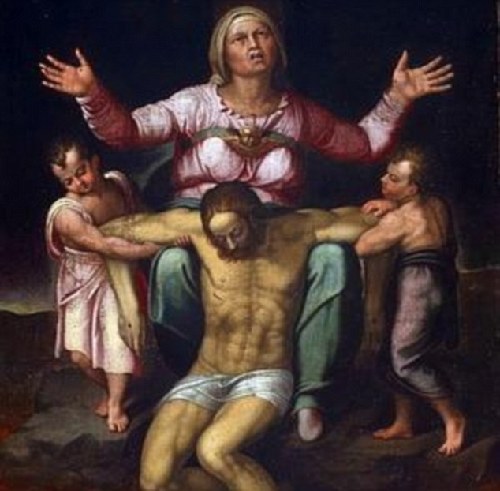 据记载,米开朗基罗是受朋友维特多里亚?科隆之邀,在1545年创作了这幅画。此后,该画经多次转手,克贝尔的祖先在1883年将其得到,随后一直保存在他们的家族中。米开朗基罗于1500年创作的一件同名大理石雕像——著名的《圣母怜子》像——现藏于意大利罗马的圣?彼得大教堂。