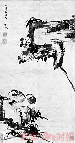 这幅《竹石鸳鸯》为立轴中堂,阔65厘米,高约120厘米,用墨笔作于明代灰纸上,款题乙酉春日写。八大山人在构图上采取了对角倚斜之势,上留天头,下着斜坡,图左下角两鸳鸯依偎于巨石之上,右上则是巨石芙蓉,看起来两相呼应,颇有野趣。
