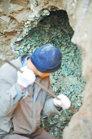由于大量铜钱被清理后运走,钱窖形成了一个高约一米,长宽超过两米的大洞。一考古人员说,现在看来,钱窖的方向由原来的南北方向拐向西边,到底钱窖有多深目前还难估计。