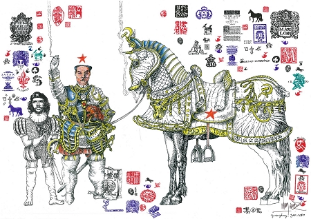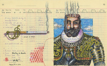 本次展览的作品以情景绘画的方式记录在旧账本上,香烟、猫、骑士、波普符号、中国印章就诞生在这些日常琐碎的消费里面,观众在欣赏了这些幽默、有趣图像的同时,也感悟了一个完美认真艺术家的日常生活。毫无疑问马若龙是一位充满活力和想象力的艺术家,他画中的形象形态各异,或高雅稳重,或粗俗野逸,有时充满了调侃,有时充满了深思。此外,中国传统纹样也是他喜欢使用的符号,青花瓷、印章、缠枝纹样等在他的作品里都可以看到。提到中国传统文化,不能不说马若龙是一位“中国通”,他对中国民间艺术尤其是明清时代的传统文化有着深厚的造诣。从教育背景说,马若龙接受的是西式教育,青年时代他在葡萄牙、瑞典、德国留学熟稔西方文化,对澳门的眷恋让他对中国文化又情有独锺。本次所展出的作品也体现了中国传统文化对他的影响,中国古人使用印章和提拔的习惯在他的画中可见端倪。马若龙是一位融汇中外、贯通古今的人,在他身上体现出了东西方文化的和谐交融。