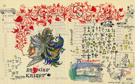 多花的煙草騎士 馬若龍 33.2 x 20.5 cm 木顏色筆、水墨於用過的會計簿紙上 2010