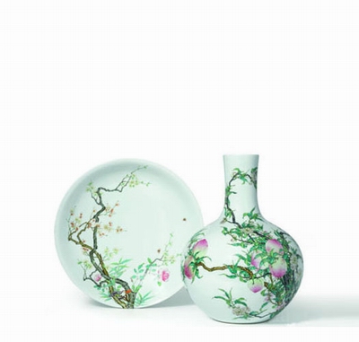 香港苏富比玫茵堂珍藏 清乾隆“粉彩九桃天球瓶”,清雍正粉彩过枝月季梅花图大盘