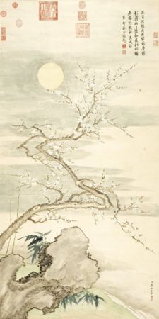 拍品资料:《竹石梅花图》为纸本设色画,纵165厘米、横82.5厘米。画幅的下方为小撮丛竹,衬托出一块太湖石,远处隐约可见潺潺溪流,一枝梅树,斜向曲折伸入画面,枝上盛开白色的梅花,画面上方一轮明月高挂,周边为疏淡的薄云,整个画面清淡、素雅。画面右下角有画家署款“臣邹一桂恭画”,画面的右上角是乾隆皇帝的题诗:“石角溪头月照渚,冰香珠影澹如如。遥知瘦似枯梅者,梅样精神未减初。辛卯新正御题。”辛卯为乾隆三十六年(公元1771年),是邹一桂去世的前一年,此时他已经是位八十五岁高龄的老人了。