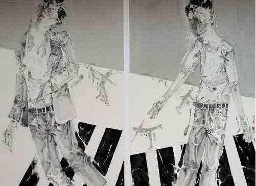 姜永安的笔墨颇具个性,《红T恤》、《鲜橙多》和《水墨写生》都以浓淡相间的墨色表现人物,突然用一块纯色打破了灰色的沉闷,既增添了画面的活力,同时也具有极强的构成效果。王晓辉的《陕北写生》系列,人物造型朴拙,浓墨勾线,设色强烈,很生动地表现了人物的身份和状态。在张正民的绘画中,一个体型硕大的儿童在微型的山水中或走、或坐、或卧,一只阴影般的飞鸟在他周围盘旋,使画面具有了一种超现实主义的意味。六位艺术家以各自对人生的感悟为我们呈现了一批精彩的作品,届时将会为观众带来一场水墨艺术盛宴。