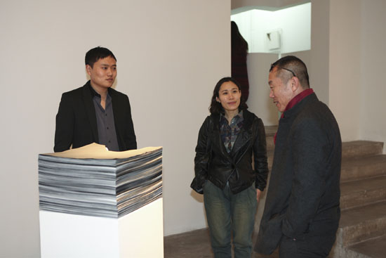 艺术家伍伟(左)向艺术家郭工(右一)讲解作品