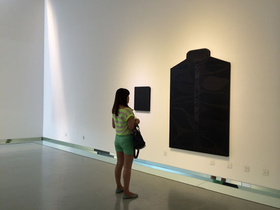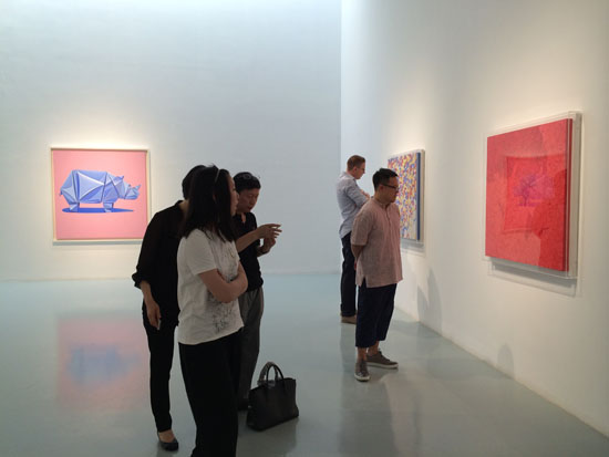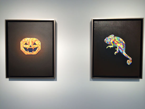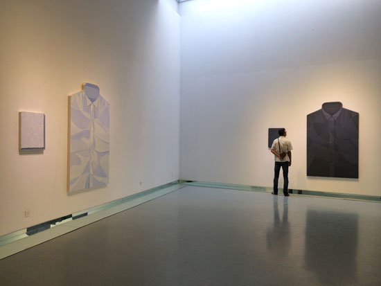 从去年底的《变色龙》到今年的《彩蝶》,《红·黄·蓝》,艺术家在以往单色“折纸”画面的基础上更添变化,从“七巧板”式的视觉游戏,到拜占庭彩绘琉璃拼贴式的繁而有序,聚光灯下的《蝙蝠》,《乌鸦》一跃跳出了画面,化为花团锦簇的彩蝶般,片片呼之欲出;《青蛙王子》像是对童年美好记忆的回望,绿皮青蛙,折纸青蛙,80后的一代“青蛙王子”终将蜕变长大;延续去年广受好评的异形《衬衣》,今年的衬衣尺寸放大到2米,郭剑将衬衣和《书》搭配成为一组作品,书来暗喻年少时被灌输的教育,思想,转而放大后的衬衣又预示着我们将充当怎样的社会角色,艺术家的一种反讽亦是一种无奈;郭剑像是一个氛围的营造者,节奏的操控者,在画面背后狡邪的布网,一步步引导观者走入二维画面中的立体世界。至于今年开始对雕塑的尝试,两组《黑天鹅》,《小象》是艺术家以2011年的两幅同名的架上作品为原型而创作的,这是一个良好的开端,是郭剑的艺术从可知,可感到可触的进化演变,也是艺术家对自己的艺术语言进一步的确定,发展和深化过程。