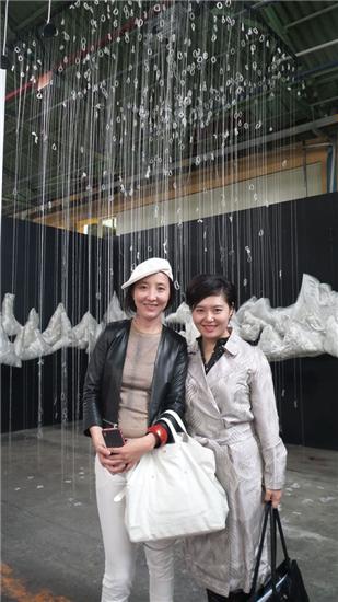 参展艺术家刘俐蕴在其作品面前与嘉宾合影
