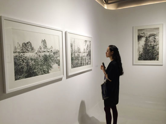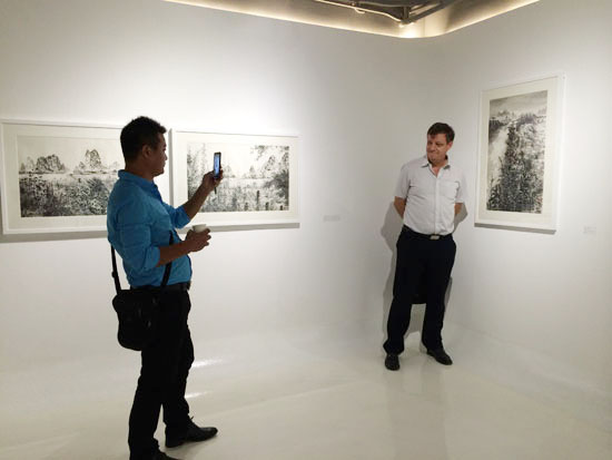 展览现场外国观众非常喜欢艺术家秦剑的作品,并在其作品《焦墨桂林3》前合影留念