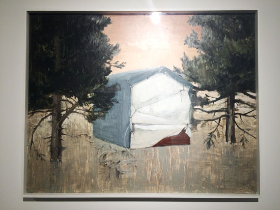 肖喆洛的绘画中隐藏着一个用来缺席的位置。这个位置有时是外在的“既亲切又陌生的某物”,简易可变的帐篷、锋利的秃树、惬意自由的养蜂人、公园里可笑的亭子、儿童摇摇车,构成来自景观社会的自嘲、城乡结合部的人文关怀以及由山寨之物引发的想象。有时这个缺席的位置也是肖喆洛内在的自己,在绘画的唯一性面前,时间被压缩在画面中,曾经的自己被逐渐沉淀在堆叠的黑色深处,停笔时,新的自己从画面里走了出来。