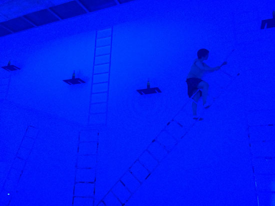 拍照、领结婚证以及展厅走廊右侧的《坚决执行一夫一妻制度》跃然于墙面上,左侧的四个“黑色通道”通往表演现场。在为期一个多月的展览期间每周六晚7点至9点都将有夜场演出,并于8月1日下午3点即将举办KCAA Talk 【邓菡彬对话唐佩贤】主题为“表演艺术与行为艺术的区别”,最后于8月21日晚9点举办展览闭幕式,最终形成一次长达八小时的晚九(九点)朝五(五点)的跨夜表演。此次展览将以一种全新的方式,多维度的解读表演艺术在当代社会中生发的无限可能,而展览中所发生的一切,都将处在与参与者(观众)的互动和随时生成的偶发过程之中。