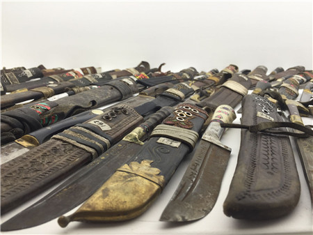 “英吉沙刀”以原产地塔里木盆地西部的英吉沙县命名,这种工艺佩刀的历史长达400年之久。对于游牧民族来说,它是重要的生活用具和装饰配件,也是抵御危险的象征与自我保护的工具。而现在,这种传统小刀也成为逐渐被消失的历史记忆。从2009年开始,赵赵陆续在新疆各地向当地人收集使用过的“英吉沙刀”。7年时间里,他从不同的个体与家庭中收到了1000把刀。与此同时,赵赵还拍摄了一部纪录片来记录收集过程中遇见的人,发生的故事。在展览中,他把这些曾经私人化的物品汇集到一起,变成面向公众展出的作品《刀》。