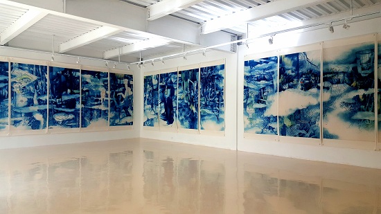 第一展厅则主要展出了可夫十几年前创作的水墨作品,他借用自己个人识别色的蓝色构建了一张张家乡的山山水水。只是这些山水作品,以观众开了一个视觉“游戏”,他将画作倒置起来,在给观者停留思考时间的同时,也给了观者一个“梦回故乡”的契机。