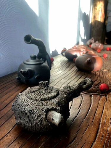 毕业于央美实验艺术系的可夫,不仅从事装置艺术和水墨作品的创作,同时还对紫砂壶颇为感兴趣,所以在1503艺术馆的第三展厅则主要展出的就是他的紫砂壶系列作品,在这些壶中,既能感受到中国古文化的茶道精神,也能在紫砂壶中的壶盖,壶柄中发现诸多他装置作品中的元素。所以说艺术原本同源,只是表达的形式不同,都是艺术家精神镜像的呈现。