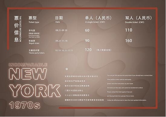 “再无纽约1970s”厂牌同时与摩登天空合作,在展览期间分别在10月19日,10月31日和11月11日推出三场主题party,详情请关注摩天轮票务平台信息或摩登天空杂志公众号。