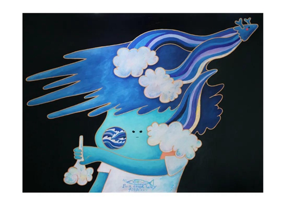 代表作《捉云朵的少年》画的是一个蓝色的孩童,头发的质感像海浪拍打的形状,云朵点缀在发间,手里还抓着一根白骨棒一样的“云棍”,云好似掉在了海上,于是,李沐霖用画面瞬间定格了那份快乐和一朵云被抓住的刹那;李沐霖把那朵云的气息凝聚在笔尖,点亮了画布。