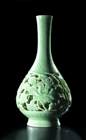 在一件清乾隆长颈胆套瓶的展示柜台前,观众簇拥最多最久,交口称赞。这是一尊夹层玲珑瓶,附着粉青釉,浮雕芭蕉叶,色泽温润可人,制作者巧妙地利用内瓶加固,用以承托外壁带两朵缠枝牡丹图案透雕的瓶身。据说,现今仅有一件造型纹饰与它完全一致的玲珑瓶,藏于北京故宫博物院。按照制造年代推算,这件玲珑瓶很可能是大名鼎鼎的督陶官唐英进呈乾隆帝的精品。唐英在乾隆二年正式成为督陶官,督导陶务前后20余年。众所周知,这一时期的清宫瓷器,无论在品种创新,还是在器物的制作技巧方面,都达到了空前水平。即将拍卖的清乾隆长颈胆套瓶,香港苏富比给出的估价为1500万-2000万港元。