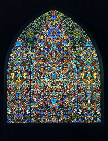 此杰作来自赫斯特着名的「蝴蝶系列」,微暗的背景上佈满蓝色、黄色和绿色的蝴蝶,以数学及几何形式排列出仿照哥德式大教堂的玫瑰窗图形,显示出他在神面前的敬畏,也表露了他错综复杂的内心世界。赫斯特亦借用蝴蝶的象徵意义及宗教图案标誌探讨生与死的问题。