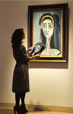 工作人员欣赏毕加索的画作《女人头像(杰奎琳)》