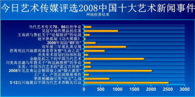 由今日艺术网、IART视频栏目、今日艺术EMAIL系列周刊、《东方艺术大家》、《东方艺术财经》、《今日美术》、《东方艺术书法》、《东方艺术国画》等,携北京今日美术馆学术委员会以及广大网友的网上投票共同评选的“2008年度中国十大艺术新闻”闪亮出炉!