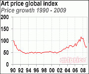 经过5个季度的收缩,艺术市场最终出现了一些积极的信号。Artprice指数(全球艺术价格指数)取得了进展,在2009年第二季度后,自2008年初超过30%的持续下跌,总算有了4.97%的上扬趋势。在2009年期间逐步复苏的经济(非常缓慢的经济增长,例如德国和法国),激起了艺术市场玩家的斗志;并且从第一季度末起,AMCI艺术市场信心指数增加了20分。
