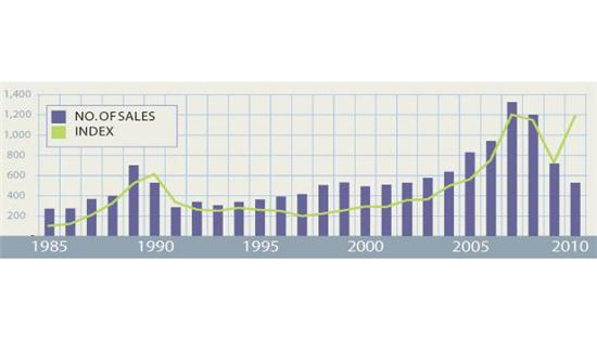 苏富比、佳士得、菲利浦斯三大拍卖行本月都举办了战后及当代艺术专场拍卖会,皆有超凡表现,为此我们为其中的“50强”画家制作了一组图表,展现他们在拍卖场上的整体表现。有如道•琼斯艺术指数,文章顶部的图表展示了1985年1月至2010年9月这50位顶级画家(名单见文末)的14211件作品的销售情况,将1985年的指数定为100。由图可见,市场在1990年达到巅峰,此后有所回落,在1997年年末降至200以下的最低点,而后从1997年至2007年恢复元气——如图中所示,指数从196升至1199。在新世纪,这些画家不仅经受住了第一个十年的股市风暴,并获得了呈两位数增长的回报。尽管在2008至2009年价格下滑有如股市崩盘,在2009年11月的拍卖会上又见回升。这些在图表中都有清晰呈现。左侧的photo gallery中的4张图表则呈现了4位迥异的艺术家的个人指数:卡尔•阿佩尔、让•杜布菲、卢西奥•丰塔纳和格哈德•里希特。阿佩尔和里希特两人的作品价格在金融危机后有了较高恢复,丰塔纳和杜布菲两人的作品价格在过去的1年中则无甚起色。