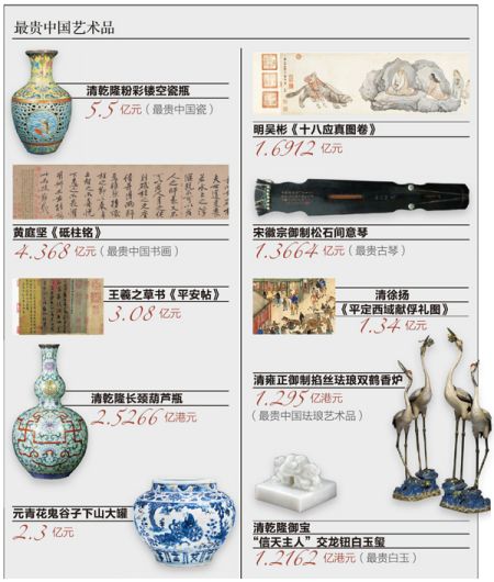 从2009年到2010年两年间,全球最贵中国艺术品的前十名几乎被全部刷新了一遍,只有原来的冠军、2005年以2.3亿元人民币成交的“鬼谷子下山”元青花瓷瓶还依然在榜。现在,排在前10名的艺术品价格全部过亿,最高的是11月份刚刚拍出的一件清乾隆粉彩镂空瓷瓶,成交价 5.5亿元人民币。