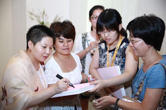 201年8月24日下午,《刹那芳华——时空中的艺术与爱情、戏剧与人生》为主题的跨界对话,如约在北京时代美术馆举行,嘉宾著名作家雪小禅、艺术家白苓飞与观众面对面,分享和讲述了她们各自的思想与情感历程。从艺术家白苓飞的生活和爱情谈起,到各自的写作和艺术创作经历,再到对女性人生的态度,让我们感受到了一种宁静中坚定的力量和诗意的人生意境。现场的观众也有感而发,将各自生活中的困惑和感悟与嘉宾进行了互动和分享。活动的最后,嘉宾雪小禅为大家演唱了一段《春闺梦》中的经典片段,舞蹈家李丹女士为大家带来了即兴舞蹈,获得了大家的阵阵掌声。按照预约活动结束后,嘉宾白苓飞和雪小禅还分别在自己新出版的书籍,《禅心寄梦》的画册以及《银碗盛雪 繁华不惊》的合集上签字,赠送给了现场的观众,伴随着浓浓的情意整个沙龙完美落幕。