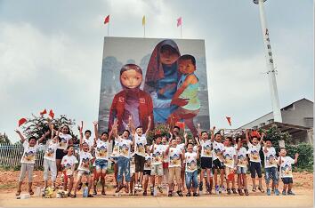 孩子们在墙绘下合影