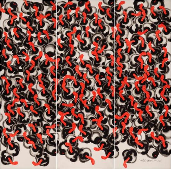 艺术家董枫老师以“巢”和“苹果”为形象主体的系列创作,是她最有代表性的作品,其通过不同的视觉符号与造型语言,表达了不同的主题思想,但无论是“巢”还是“苹果”,它们的基础形态都是以“圆”的态势存在的。“圆”是她潜意识里对形象的客观“需求”,并会通过看不见的“规矩”去选择,这个形态属于艺术家本身,它具象化了艺术家的价值观、审美观、哲学观甚至思想内核。“圆”的形象延伸是中国传统文化中十分重要的精神象征与意识形态。“圆”为起源与初始,盘古劈开了如鸡子般的混沌之态而形成天与地,这是中国古代传说中一切的起始,而在中国哲学中恰恰把这混沌无形的气视为圆,它含有生成与物化万事万物的能与态。“圆”为融通。正如陈几叟所言:“月落万川,处处皆圆……”。天上一轮圆月映在天下万千川流之中,即“一是所有”;但每个川流中的圆影都是圆月完整呈现,即“所有为一”。这即是万物间圆的延伸与融通,也反映了万物皆为一个圆满完整的生命体与小宇宙。“圆”因为转动故有生生不息之态。它的态势流动、运转不息,无所拘束,并从中产生很多气与韵的延伸与变化,这在形式上生成了更多种可能,也反映了生命的延绵不绝与循环往复。“圆”更会生成一个浑化的至高境界。《蕙风词话》中言:“笔圆下乘,意圆中乘,神圆上乘”。这种境界就是“忘掉了”客观的形式与形态,为生命的圆融而呈现,万事万物仅用一气流淌而成,并生出无限神韵。艺术家董枫老师的《苹果》系列作品的呈现可归结为生命的起源与萌发;生命形态的涌动、交合与融通;生命态势的生生不息与意境的气韵生动;以及作品整体由物生境、以形生态的酣畅淋漓与浑化无迹。