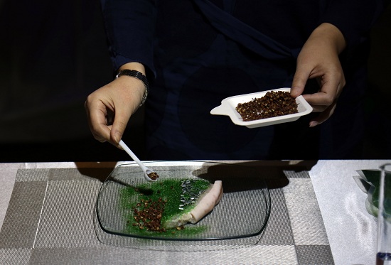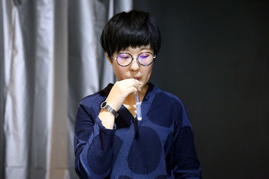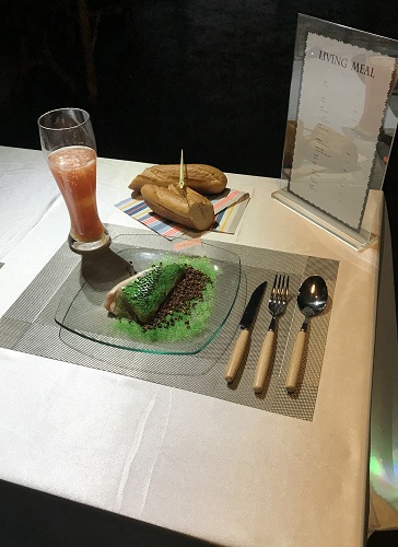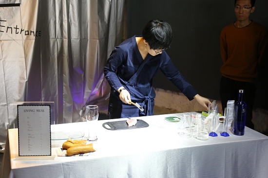 行为表演《LIVING》中,赵涓涓为大家做了一顿看似很好吃的“饭”。她将一根根尖锐的钢钉重复地钉入鲜肉,然后搭配以人工草粉和花椒。随后又用唾液、伏特加、果汁与碳酸氢钠等材料一起调制了一杯饮品,与带有时间装置的面包一起组成了丰盛的一餐。