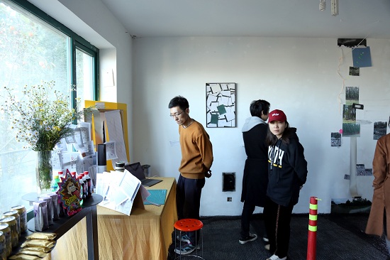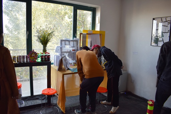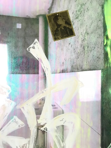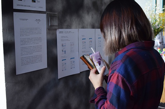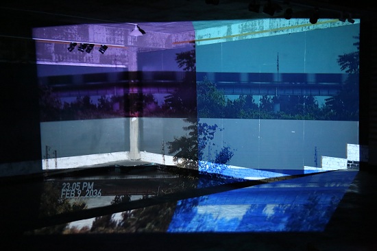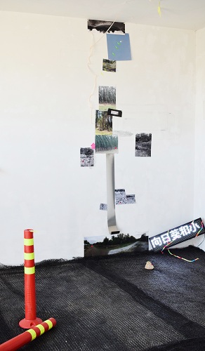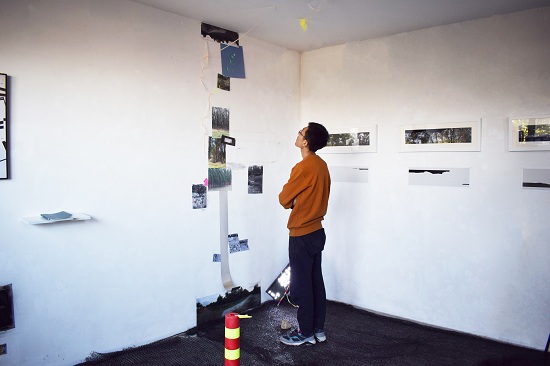 《无及之地》中,艺术家无意识地通过照片记录了自然场域和人类社会发展过程中的“意外”,伏倒的大树、电脑操作失误的提醒……透过这些“意外”,艺术家为我们呈现了一个个交错并置的“事件”。与此同时,艺术家将作品中的石头进行了无序编号,将道路设置了路障,通过人在作品中肆意而主观性地的介入,隐喻人类与自然的关系,记录下人类作为主体在自然场域中作用而发生的直接和间接的事件。此外,通过作品的LED电子屏观众可使用WiFi连接进行与作品的互动,观众可发送任意信息到屏幕,参与这个开放式的叙事过程。