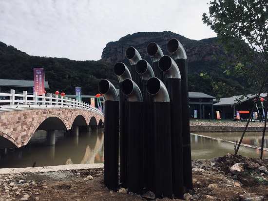 艺术现场制作是本次活动的最大亮点。艺术家们克服种种不便,十几天时间,电焊、抛光、打孔、喷漆,亲力亲为,变身为工人。一件件高艺术水准与自然语境相符的艺术作品散布在东太行山水之间,艺术边缘的武安有了与世界同步的观念实体作品。整个现场过程在东太行旅发大会的主场地工地,景区基建与艺术作品同步进行,所涉及的人和事本身就是一次有互动参与的社会活动。东太行为背景行为艺术力作“去锁”和古村落为现场的“收声”展现了现场的魅力,一次当代文明姿态的“打开”进行时。灵魂是作品的内涵,现场艺术活动的开放性自觉不自觉地展开了社会美育的功能。山美术馆的架上展出作品与散布在大自然中的装置景观作品联动,丰满了艺术季,丰富了艺术季的内容。