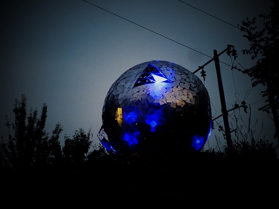 作品整体以银色圆形球体呈现在大的环境之中。正圆的,非常规则的球体在自然环境中似乎显得突兀。但透过天空浩瀚宇宙,哪一颗星辰不是以圆形面貌呈现呢?球体是自然背后的理性的“自然”,是更加接近真实的自然。