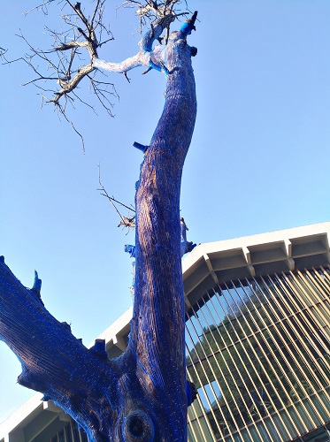 车毂、刹车片、轴承以及电机芯组合成一棵绽放的大花树,带有生命的勃发意向。花蕊拟人化处理,右手一指向天,向遥远的柏拉图致敬。头部用的是随机打碎的玻璃块,幽蓝纯净,象征人类的智慧之源。