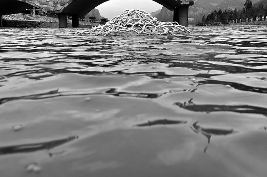 丛台酒店人造景观湖里错落摆放着的几块原石,静谧折叠出倒影,在水面映像出石体的虚幻。作品用铁笼(部分铁丝缠绕白色绳子)敲打勾勒出原石的身躯,网格状的铁线通过力的转移,摸索出原石的经脉,改变了原石的重量平移到湖面的另一端,妄图制造出原石水面倒影般空的虚幻。